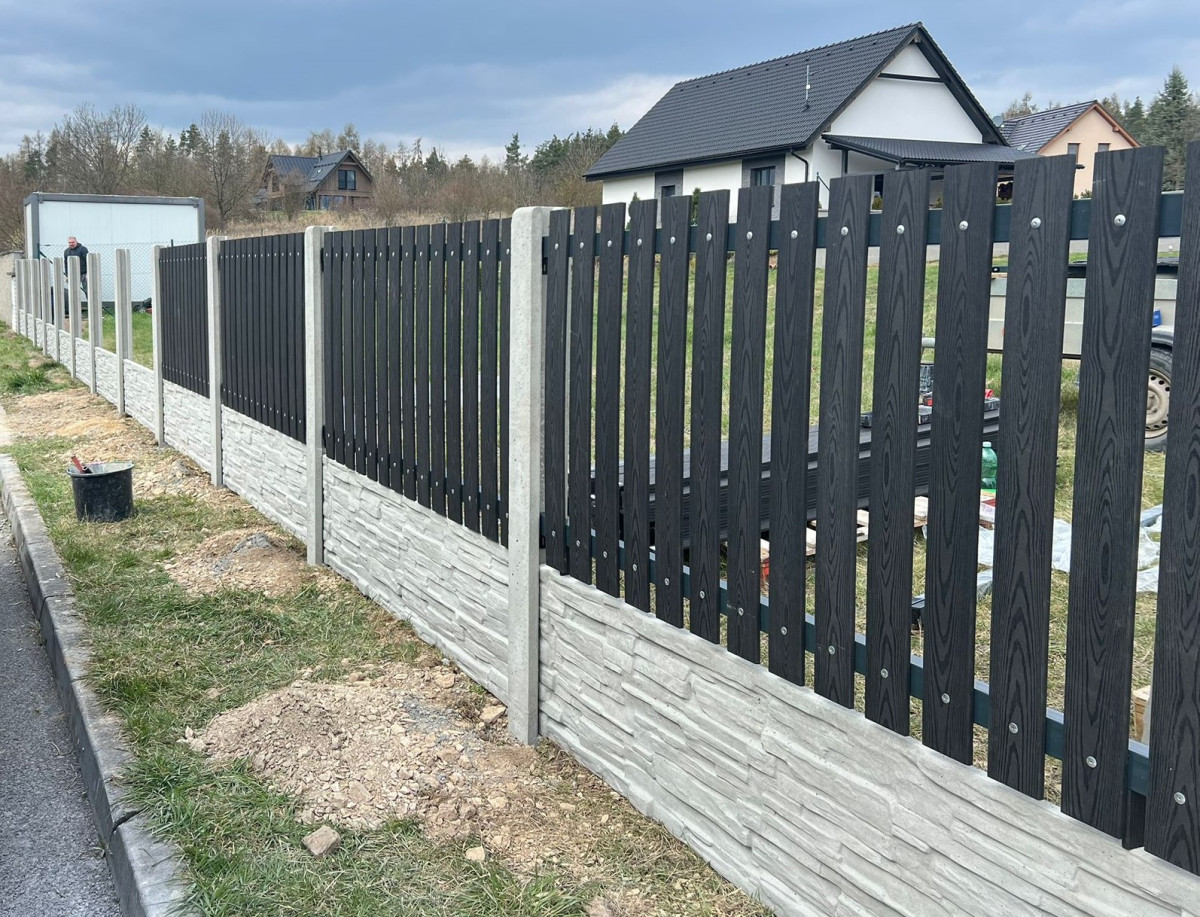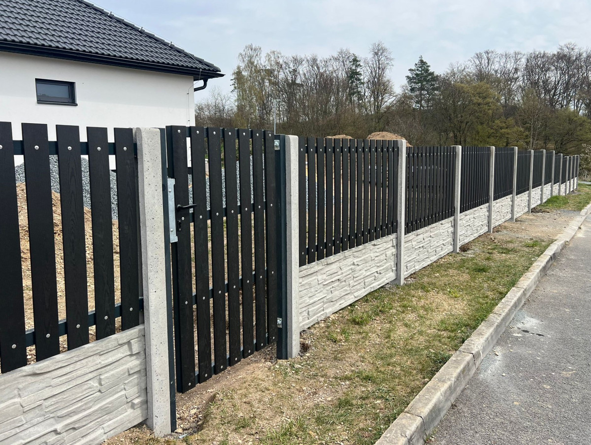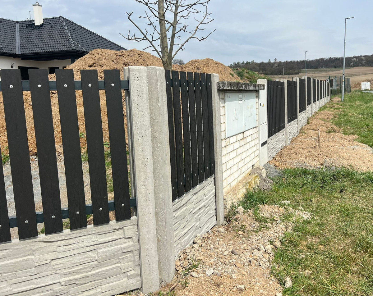 Sýkořice, 4/2026, 90bm kombinace beton a WPC plotovky, brána s pohonem , branka